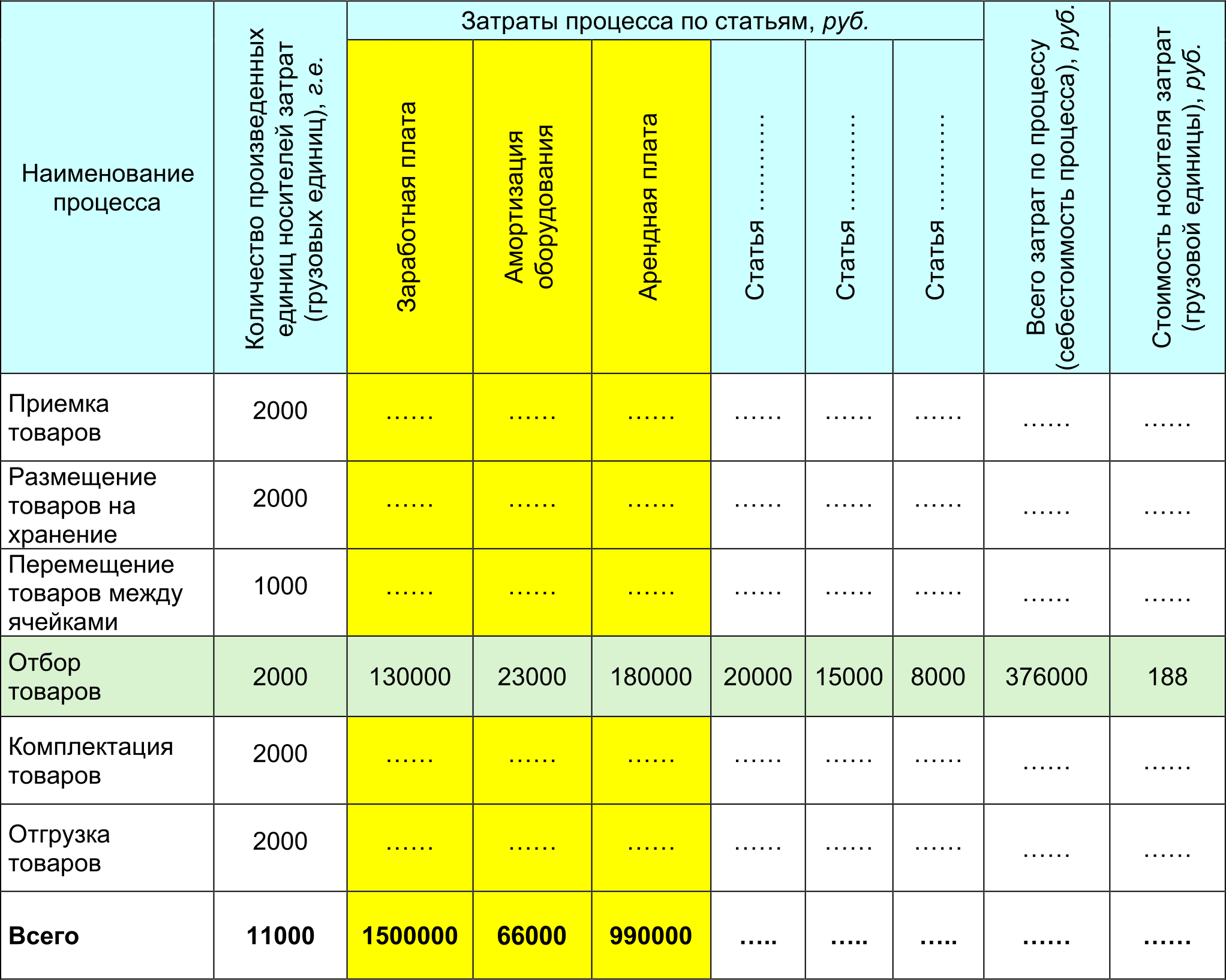 1. Расчетно-опытным путем используя для расчета имеющееся количество ресурсов (персонал, техника и оборудование, время работы склада, программное обеспечение, нормы и др.), а также технологические возможности склада, для каждого процесса мы определяем плановое количество обрабатываемых (производимых) единиц носителей затрат (грузовых единиц).